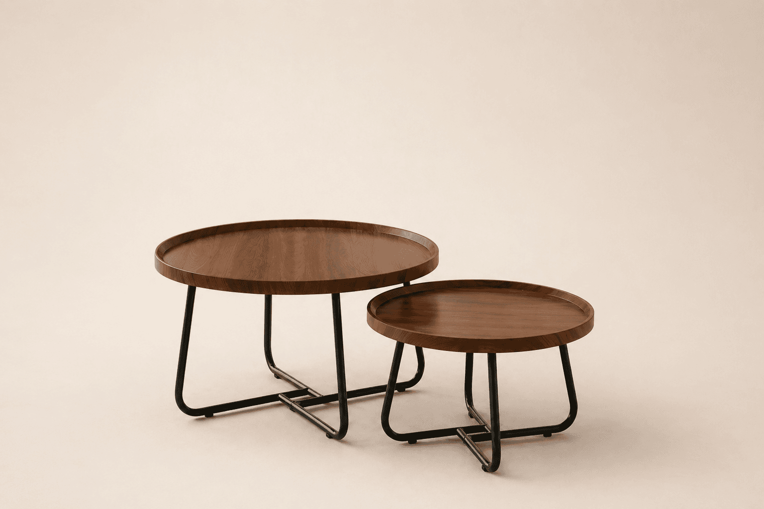 Diese runden Beistelltische im 2er-Set bringen Wärme, Struktur und Leichtigkeit in Ihren Wohnraum. Inspiriert von nordischer Zurückhaltung und der klaren Eleganz des Mid-Century-Stils verbinden sie natürliche Holzoptik mit einem feinen Metallgestell zu einem harmonischen Gesamtbild. Durch das platzsparende Nesting-Design lassen sich beide Tische flexibel arrangieren – eng zusammengestellt für einen ruhigen, gestaffelten Look oder einzeln im Raum als stilvolle Ablagefläche. So entstehen Wohnbilder, die nicht überladen wirken, sondern bewusst und ausgeglichen. Die sanft erhöhte Kante verleiht den Tischen nicht nur ihren charakteristischen Tablett-Look, sondern sorgt auch im Alltag für mehr Sicherheit. Tassen, Bücher, Kerzen oder kleine Dekorationen bleiben zuverlässig an ihrem Platz. Gleichzeitig überzeugt das Set durch robuste Materialien: hochwertiges MDF mit fein verarbeiteter Oberfläche und ein stabiles Metallgestell für langlebige Stabilität. Ob vor dem Sofa, neben einem Sessel oder als ruhige Akzentmöbel im Schlafzimmer – dieses 2er-Set schafft eine wohnliche Atmosphäre mit klaren Linien und zeitloser Wirkung.